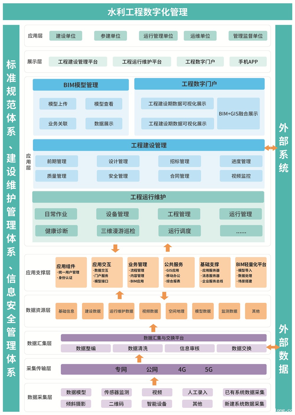水利工程建设数字化管理平台是以工程建设管理为和核心,把水利工程建设全过程主要环节如质量、安全、进度、合同等的流程、数据通过数字化模型进行可视化展示和数据传承,为行业主管单位、项目法人以及各参建单位之间搭建一个统一的工作平台。该平台利用了当前前沿的数字技术,如BIM建模技术等,通过使用数字模型,有效集成项目设计、施工、运维全阶段所产生的数据信息,提升信息传递效率、降低数据利用损失,从而提升工程建设质量、安全水平。