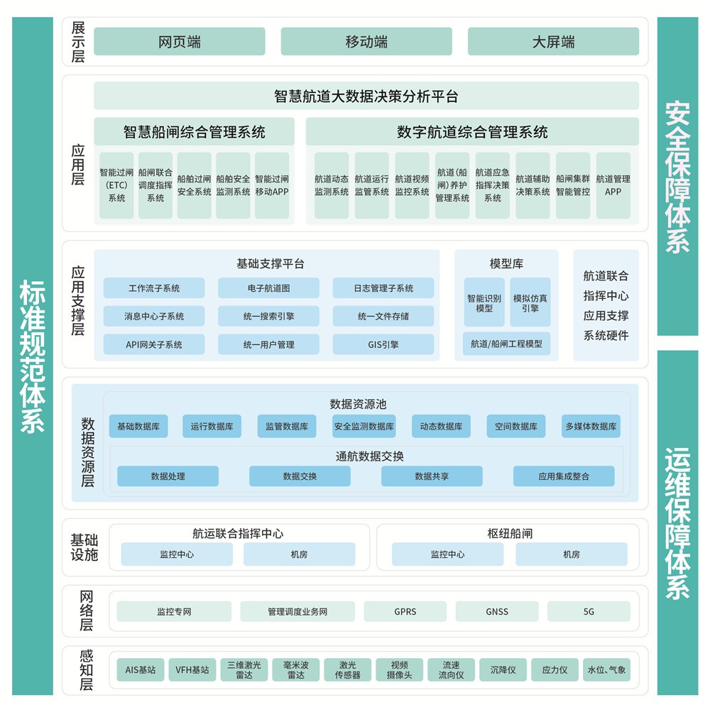 建设航道工程建管系统和航道工程运管系统。航道工程建管系统将航道工程建设全过程主要环节的文件、数据等通过网络终端和平台生成、传递、交换及存储,从勘察设计、招投标、施工过程、质量、安全、进度、支付、合同、检查验收、施工现场安全等角度为行业主管单位、项目法人以及各参建单位之间搭建高统一的工作平台;航道工程运管系统对航道各类动静态工程信息进行统一管理,加强包括船闸在内的水利航运工程管理,保障船闸工程的安全与正常运行,实现船闸各系统、设备等对象全过程运行维护、管理和监督,提升船闸工程专业化、精细化和标准化管理水平。