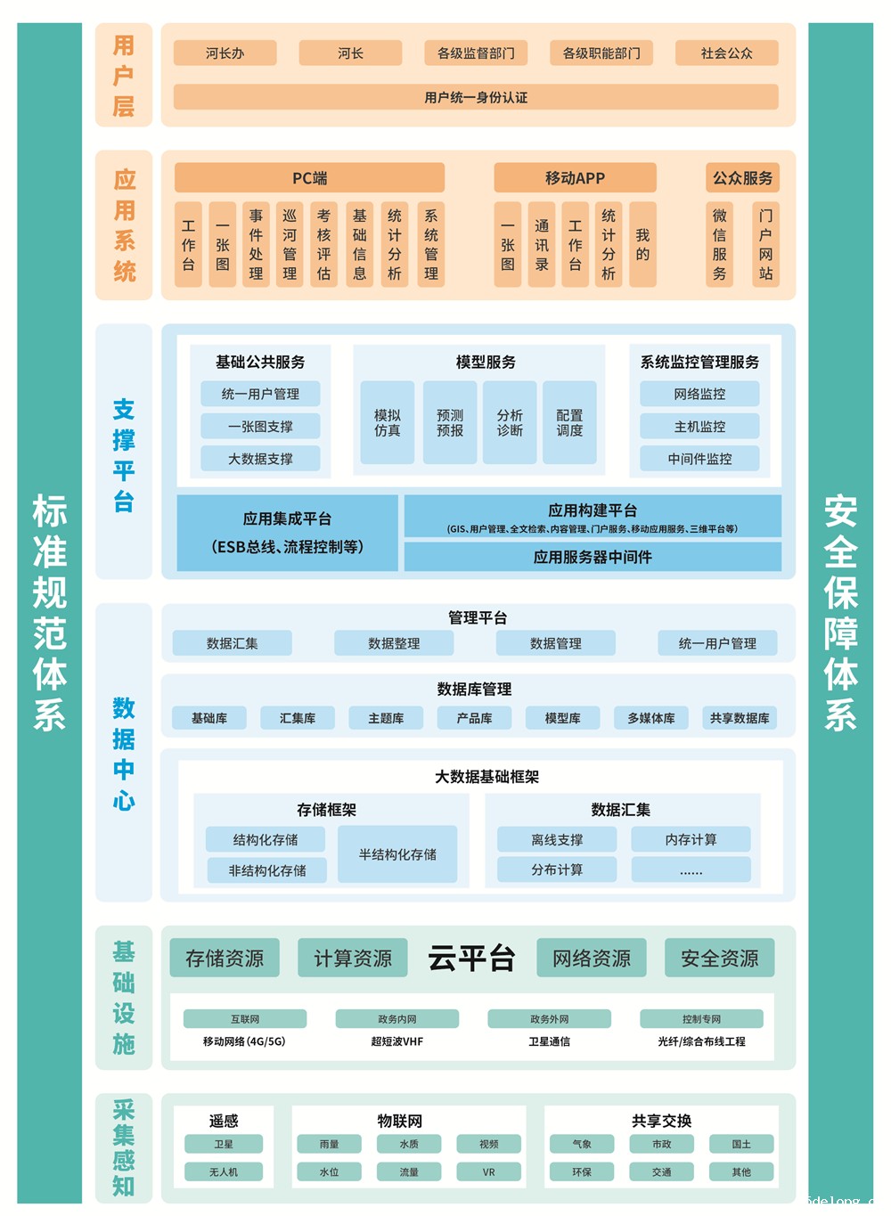 应用系统层:立足于信息平台的数据资源,以服务于河(湖)长制各项任务的开展和业务的执行为目标,为用户提供综合信息服务,即整个系统管理端、移动APP、微信公众号和门户网站的数据管理、信息展现和决策支撑服务。